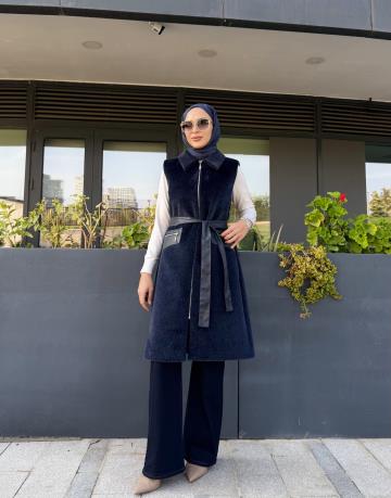 DERİ CEP DETAY ANGORA YELEK LACİVERT