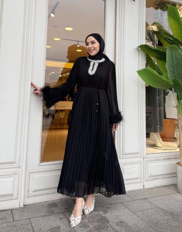 İTHAL YAKASI TAŞLI ŞİFON ELBİSE SİYAH