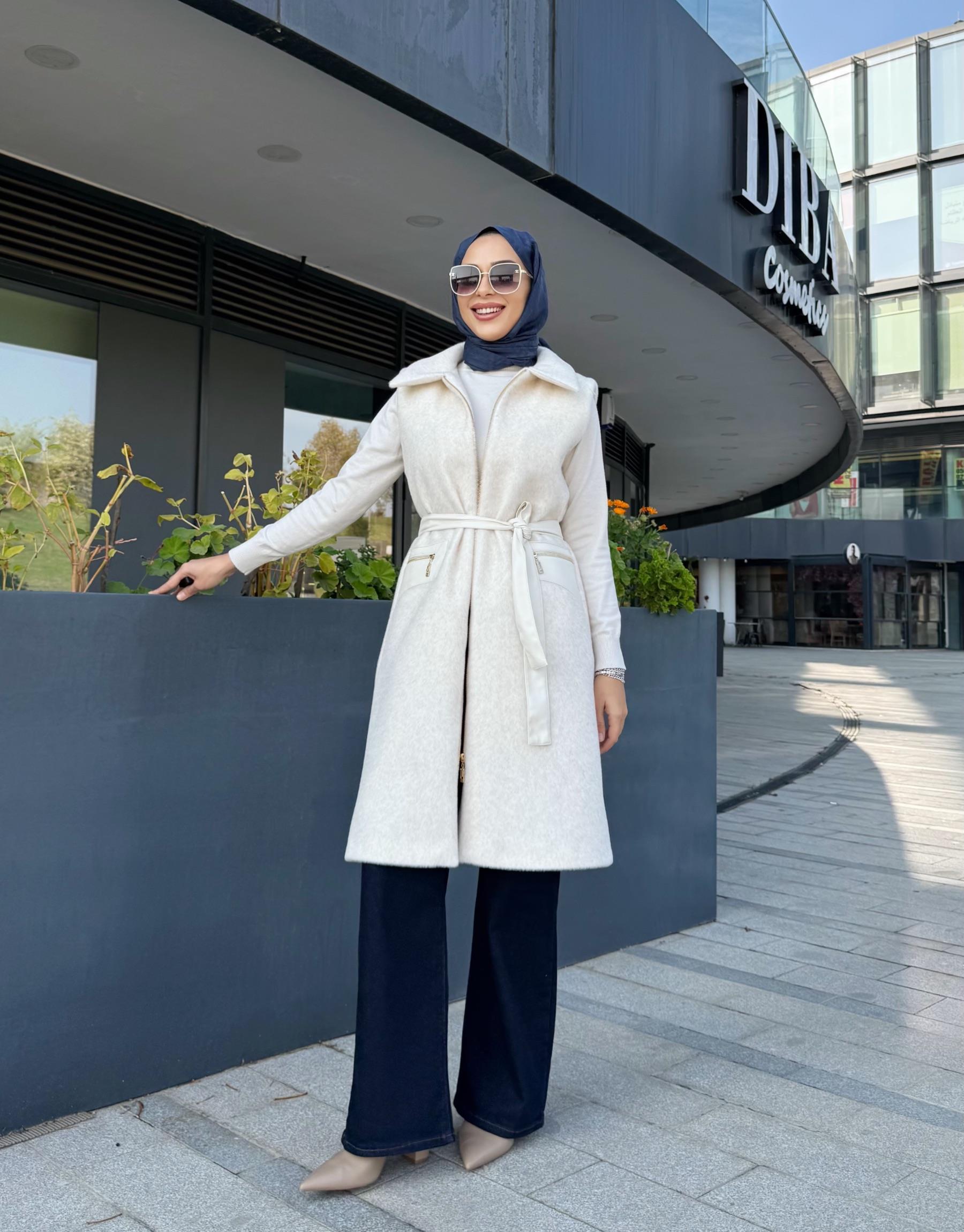 DERİ CEP DETAY ANGORA YELEK EKRU