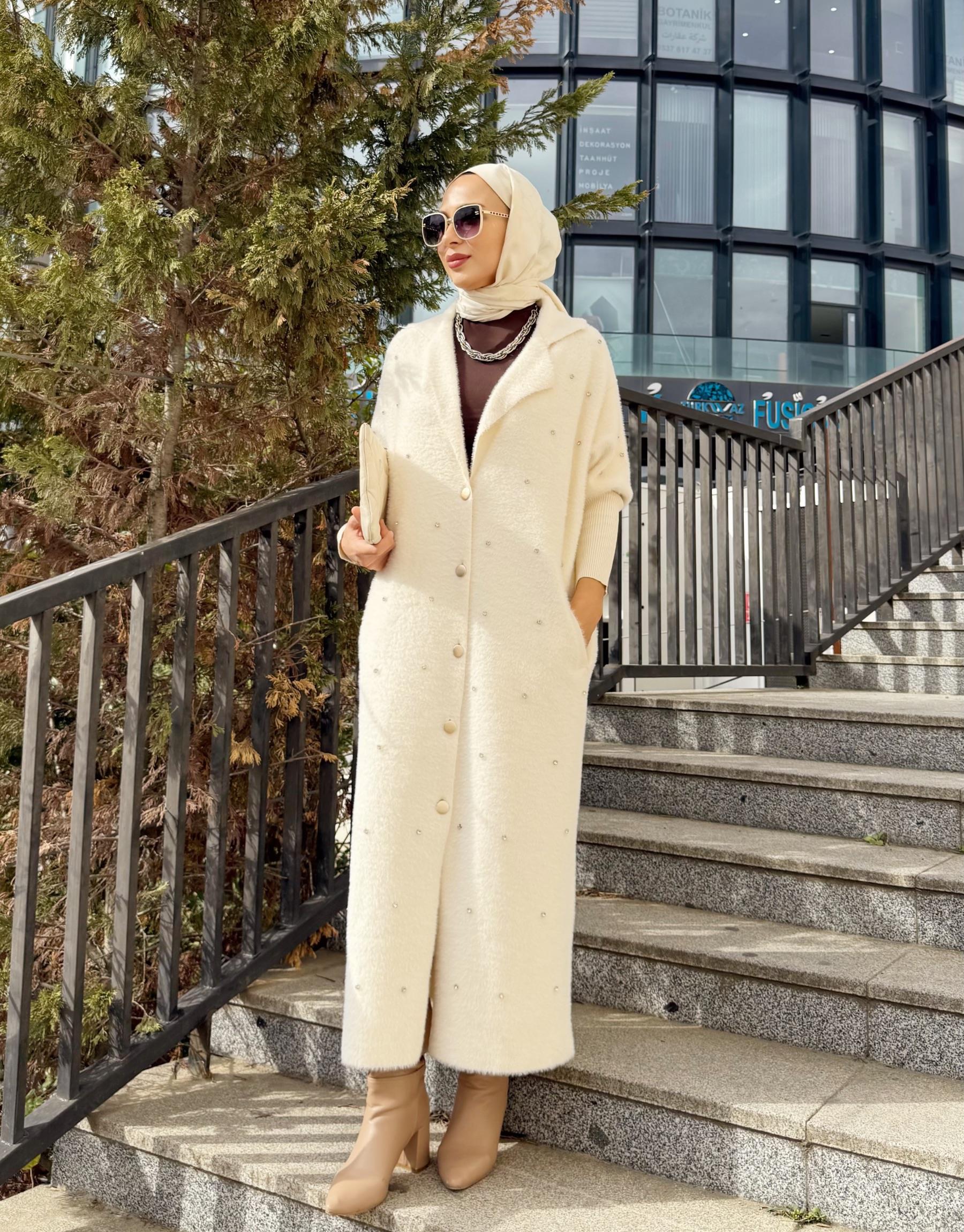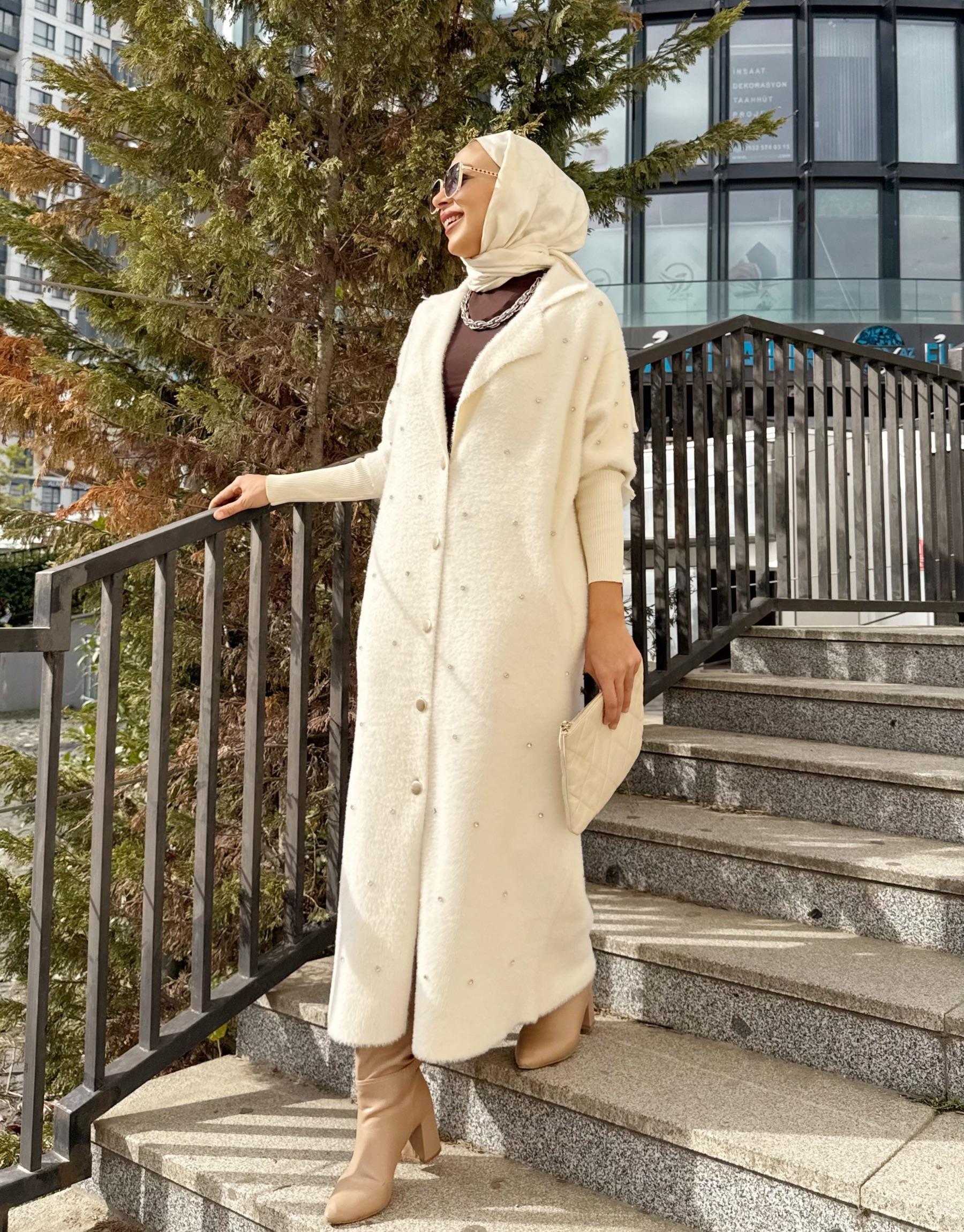 KOLU TRİKO SERPME TAŞLI ANGORA HIRKA EKRU