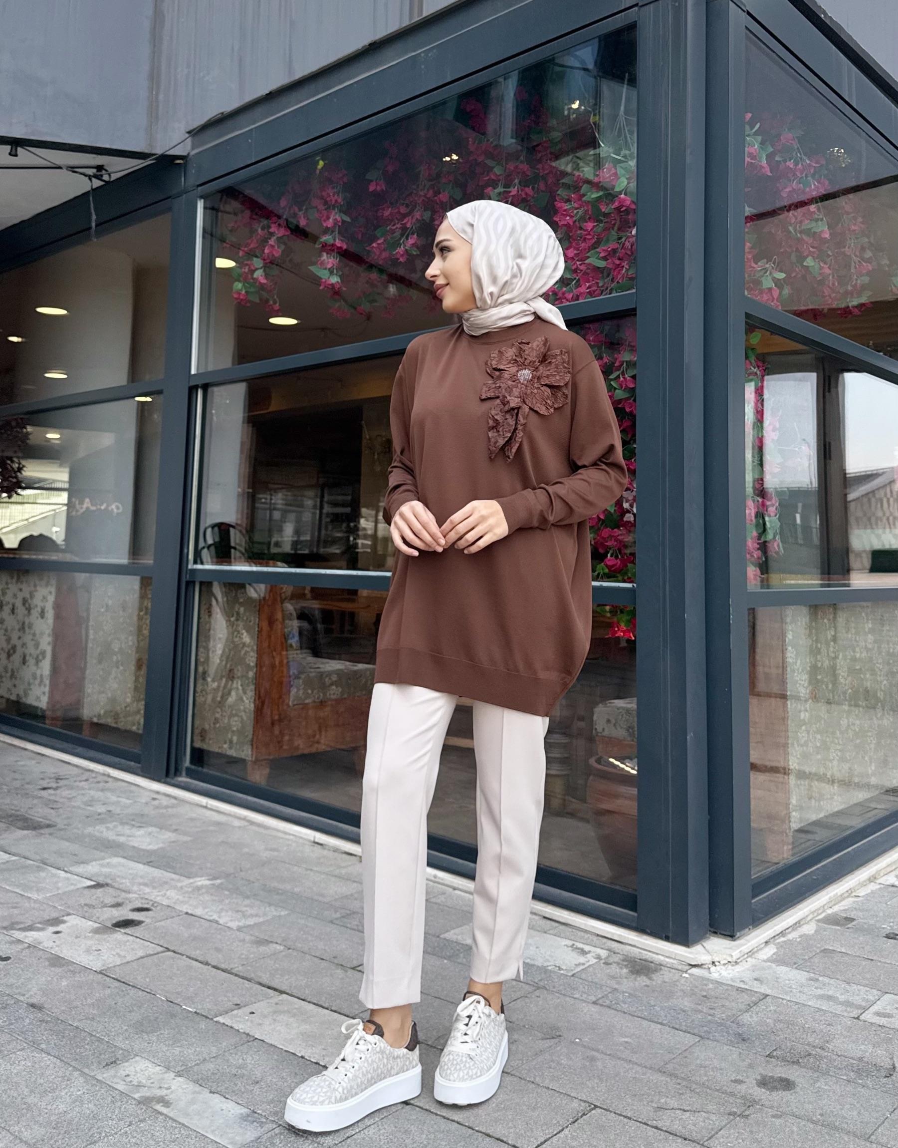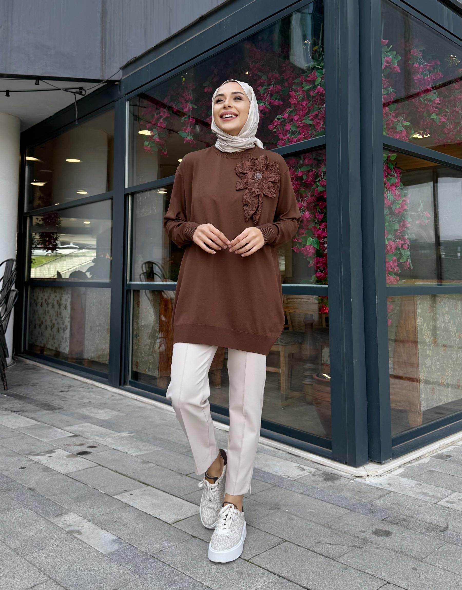 ÇİÇEKLİ TRİKO TUNİK KAHVE