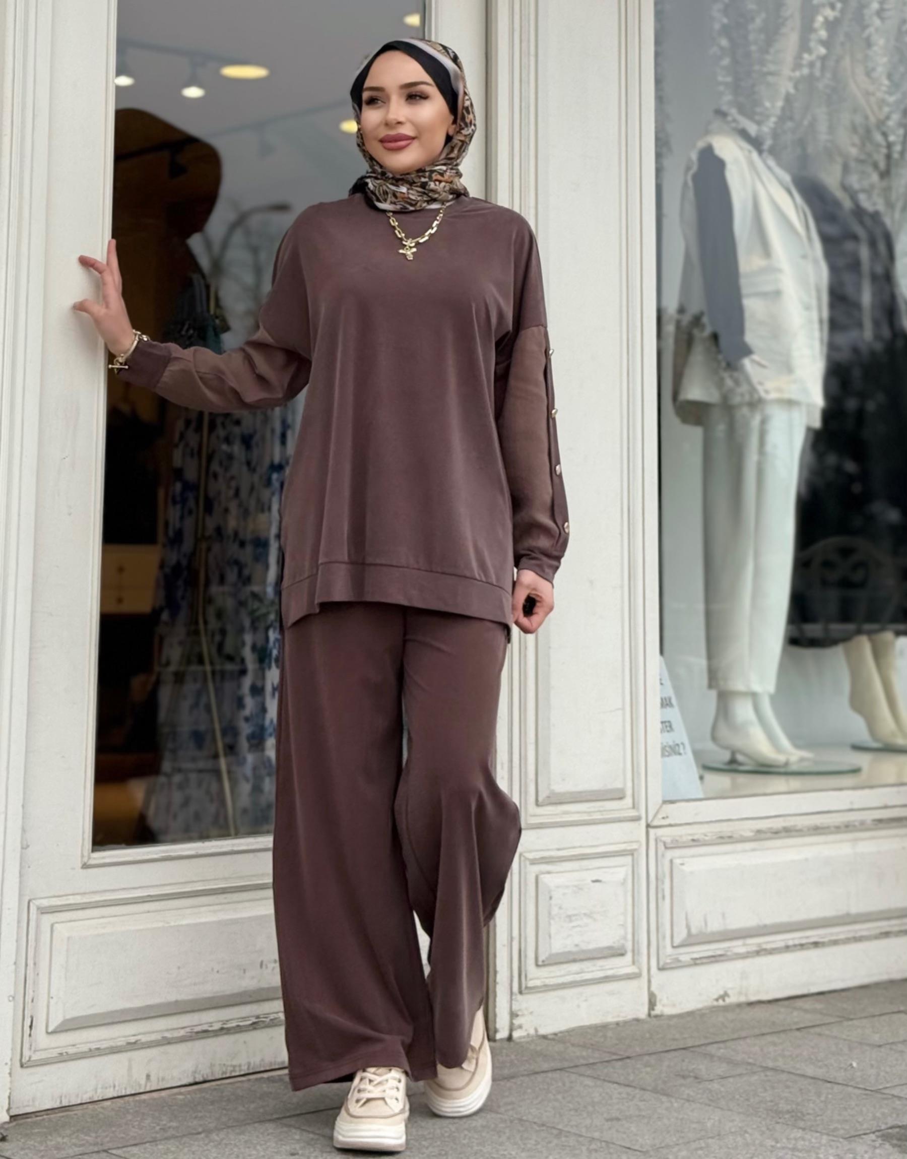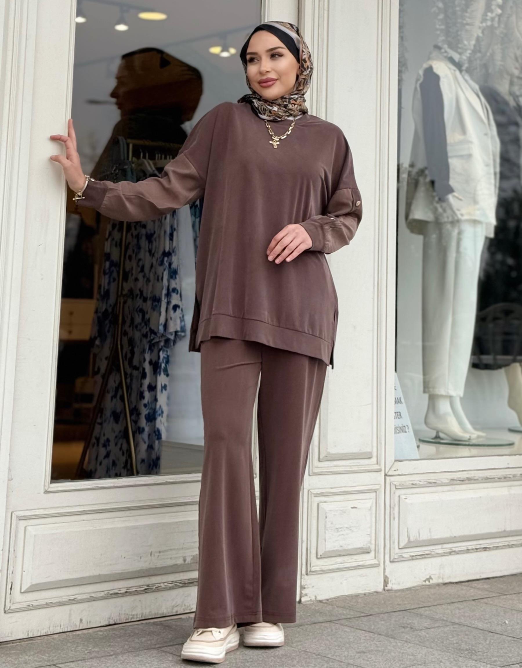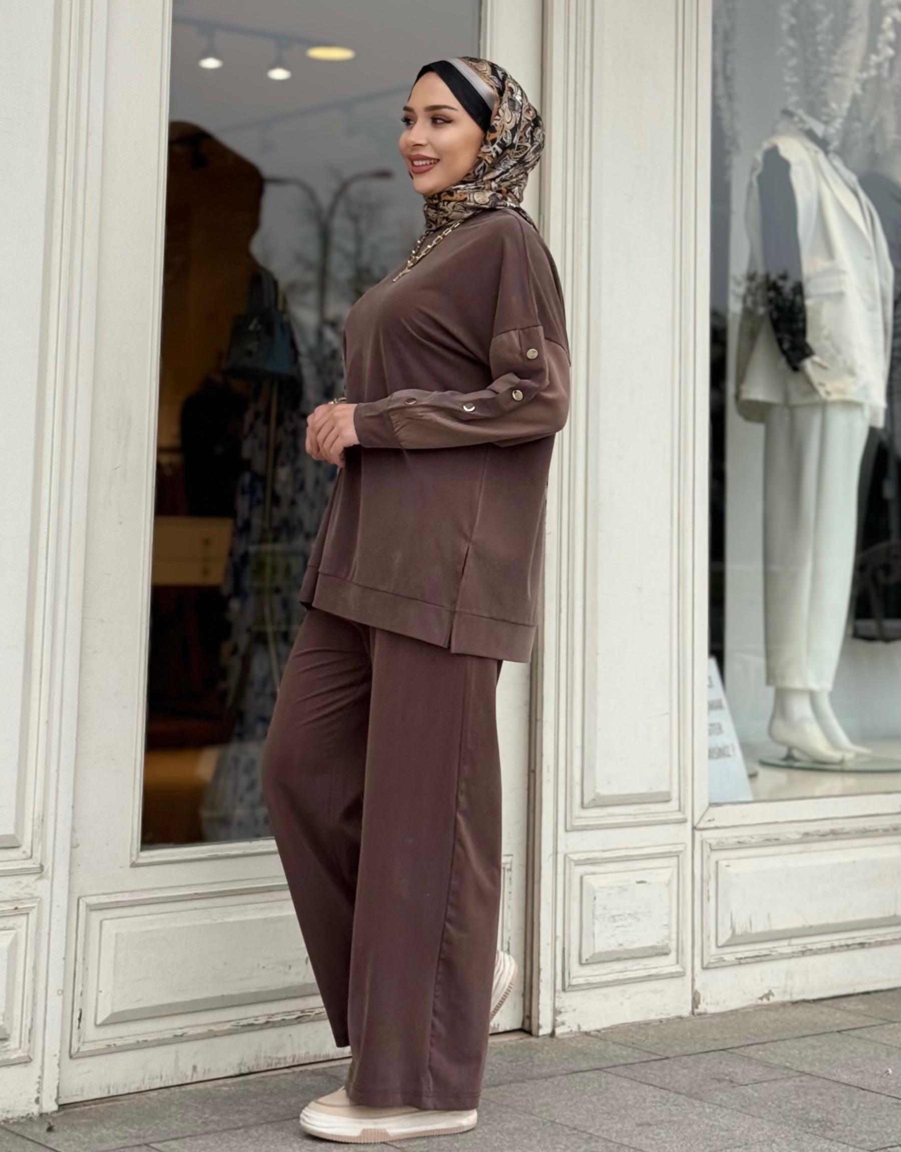 GARNİLİLİ PLİSE PANTALONLU TAKIM KAHVE
