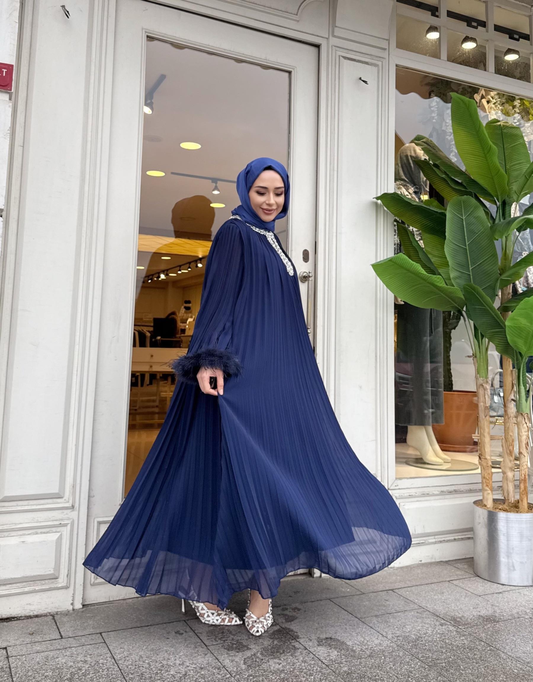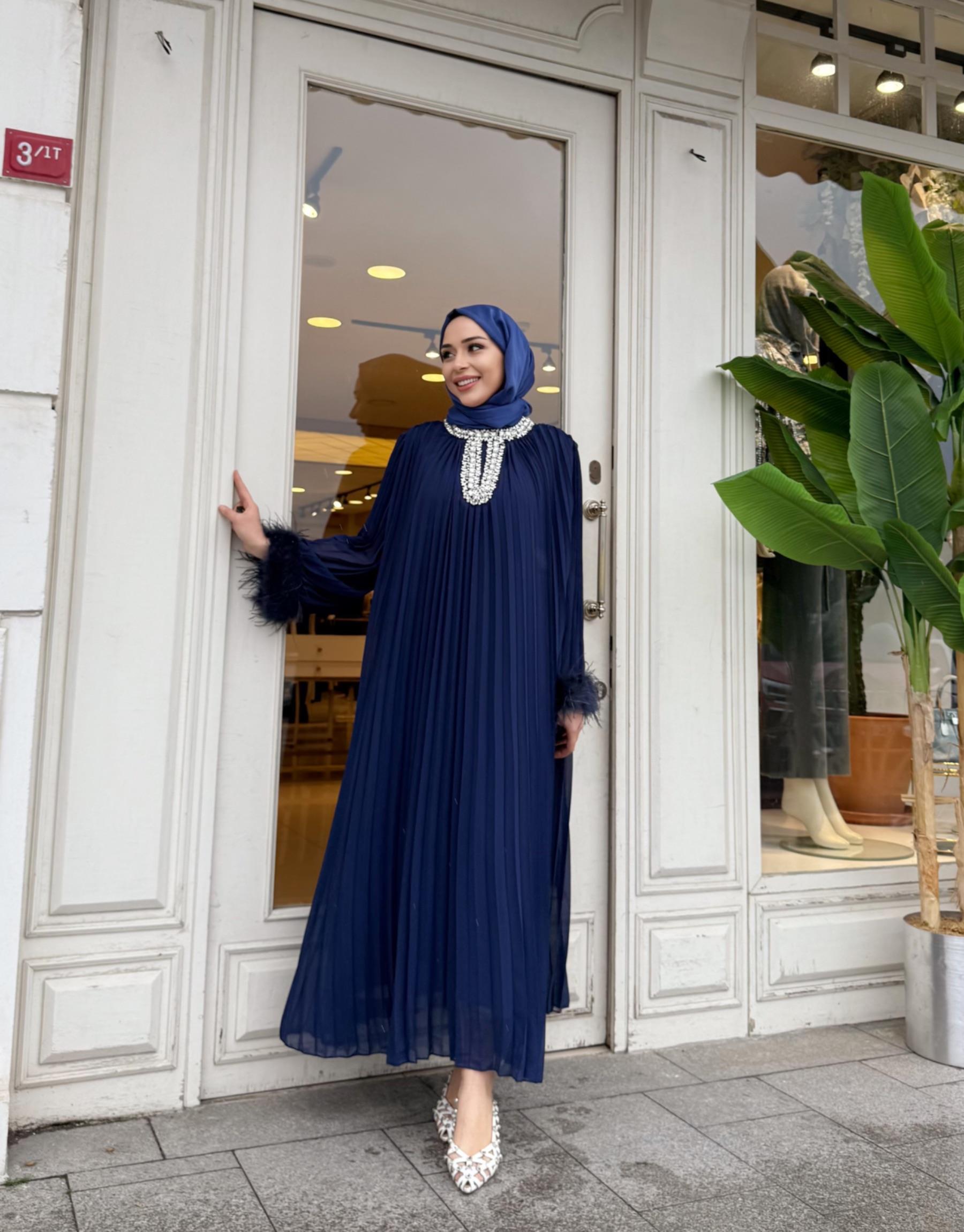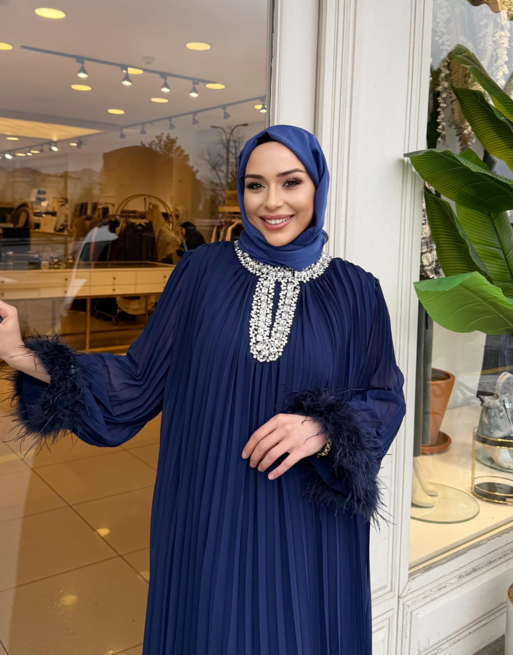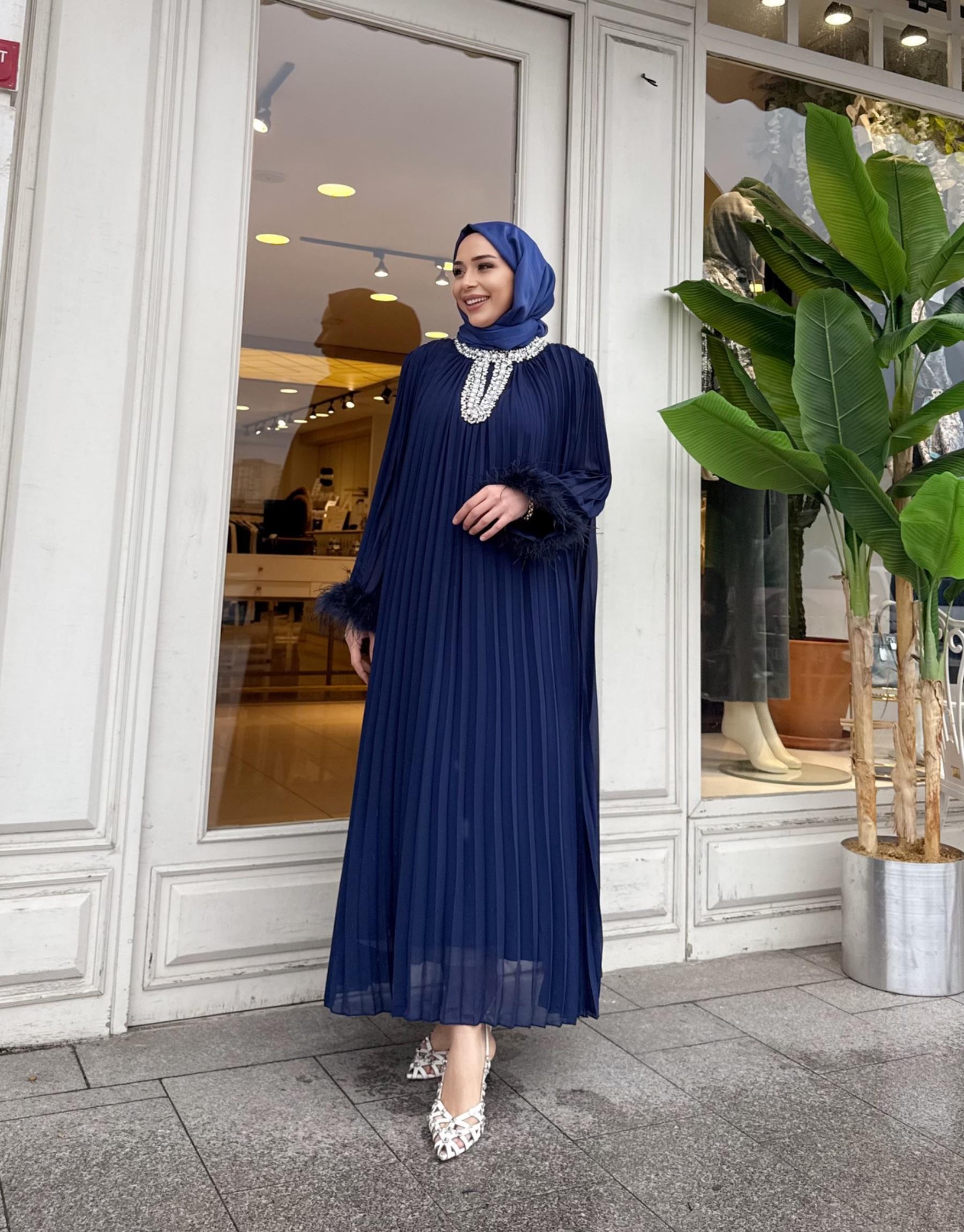 İTHAL YAKASI TAŞLI ŞİFON ELBİSE LACİVERT