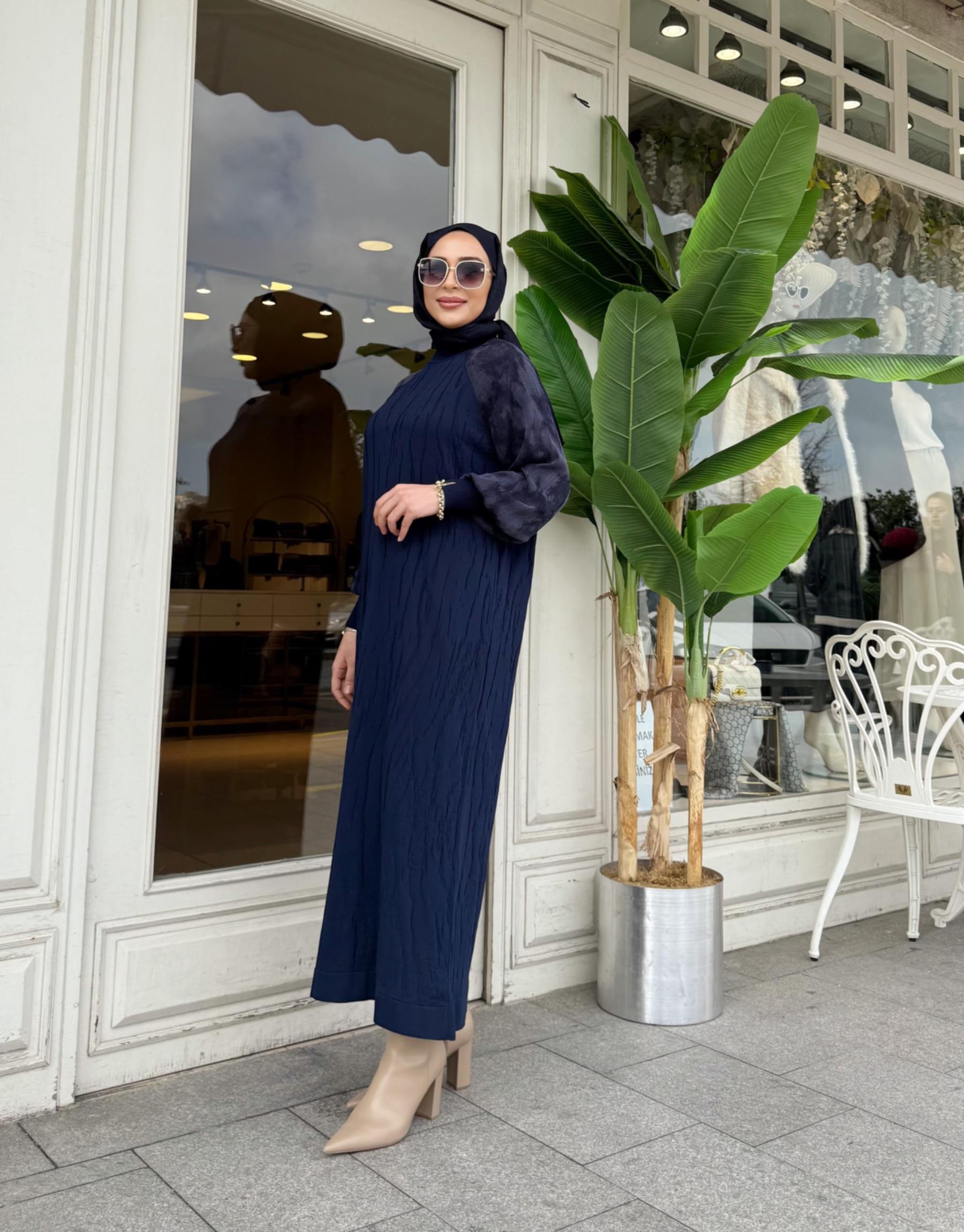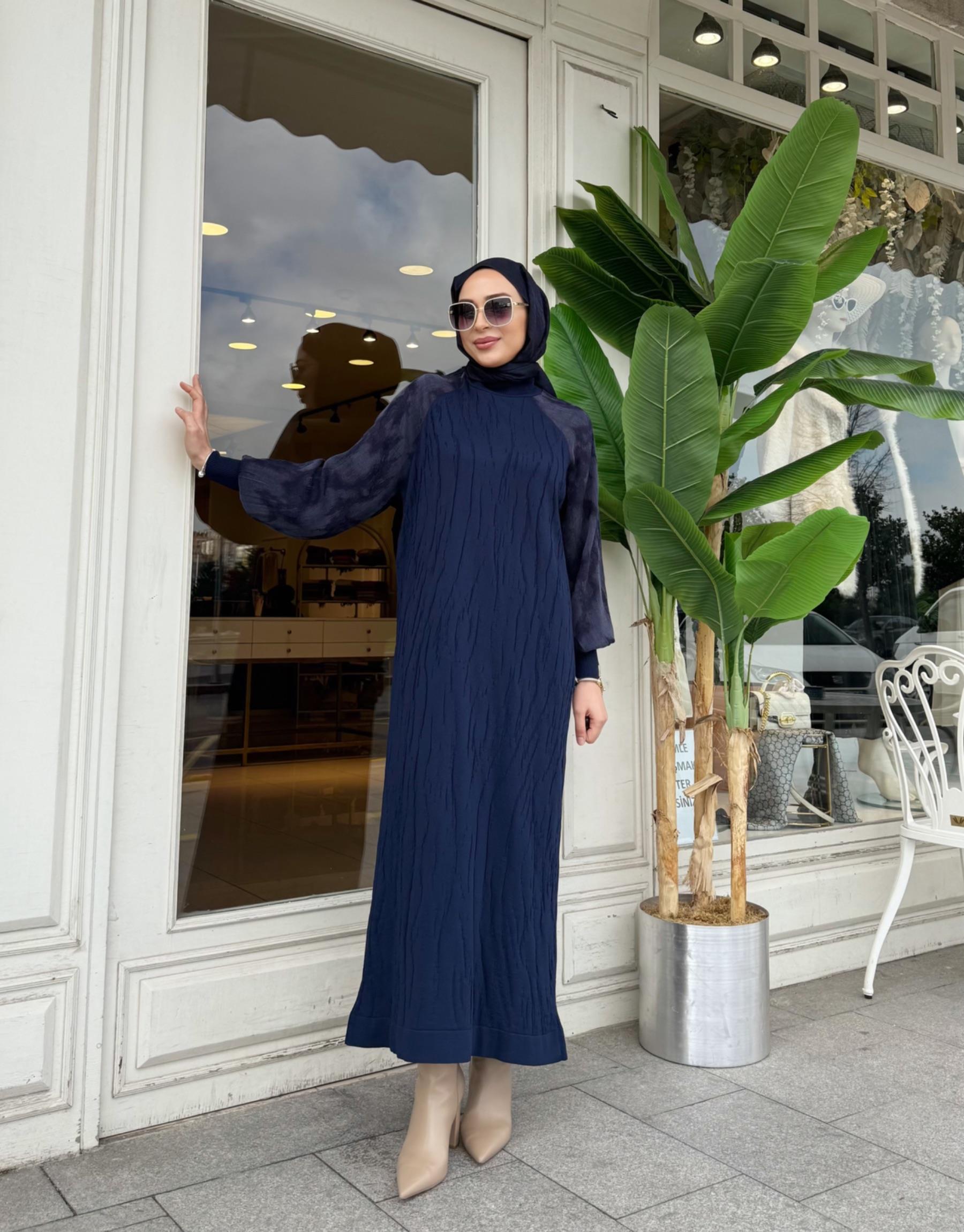 İPEK QUPRA KOL DETAY SOĞUK İPLİK ELBİSE LACİVERT