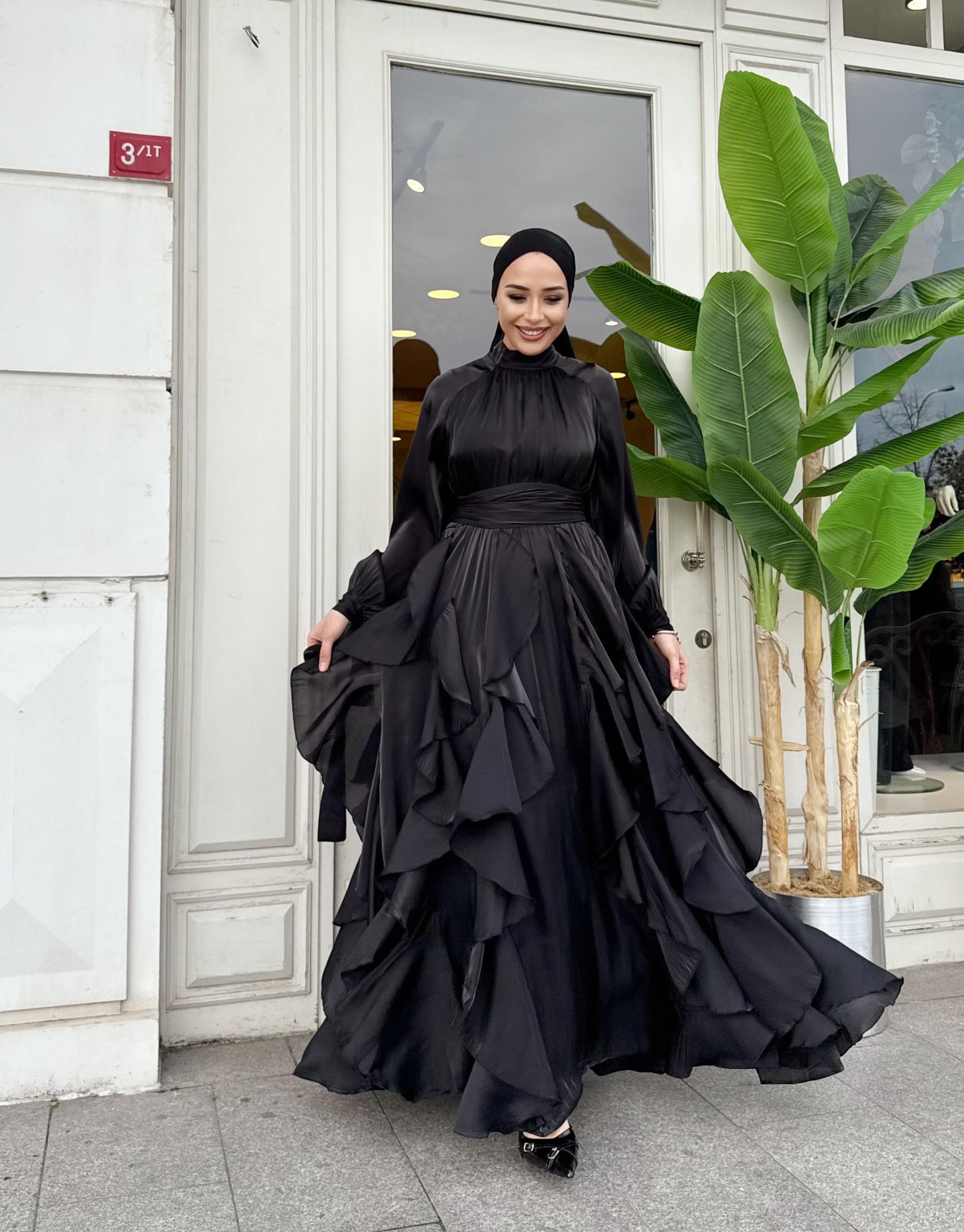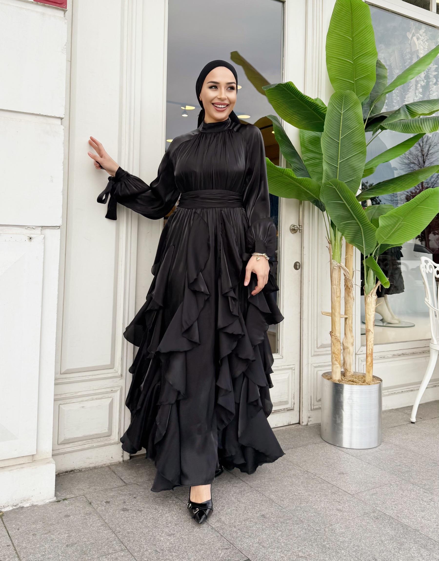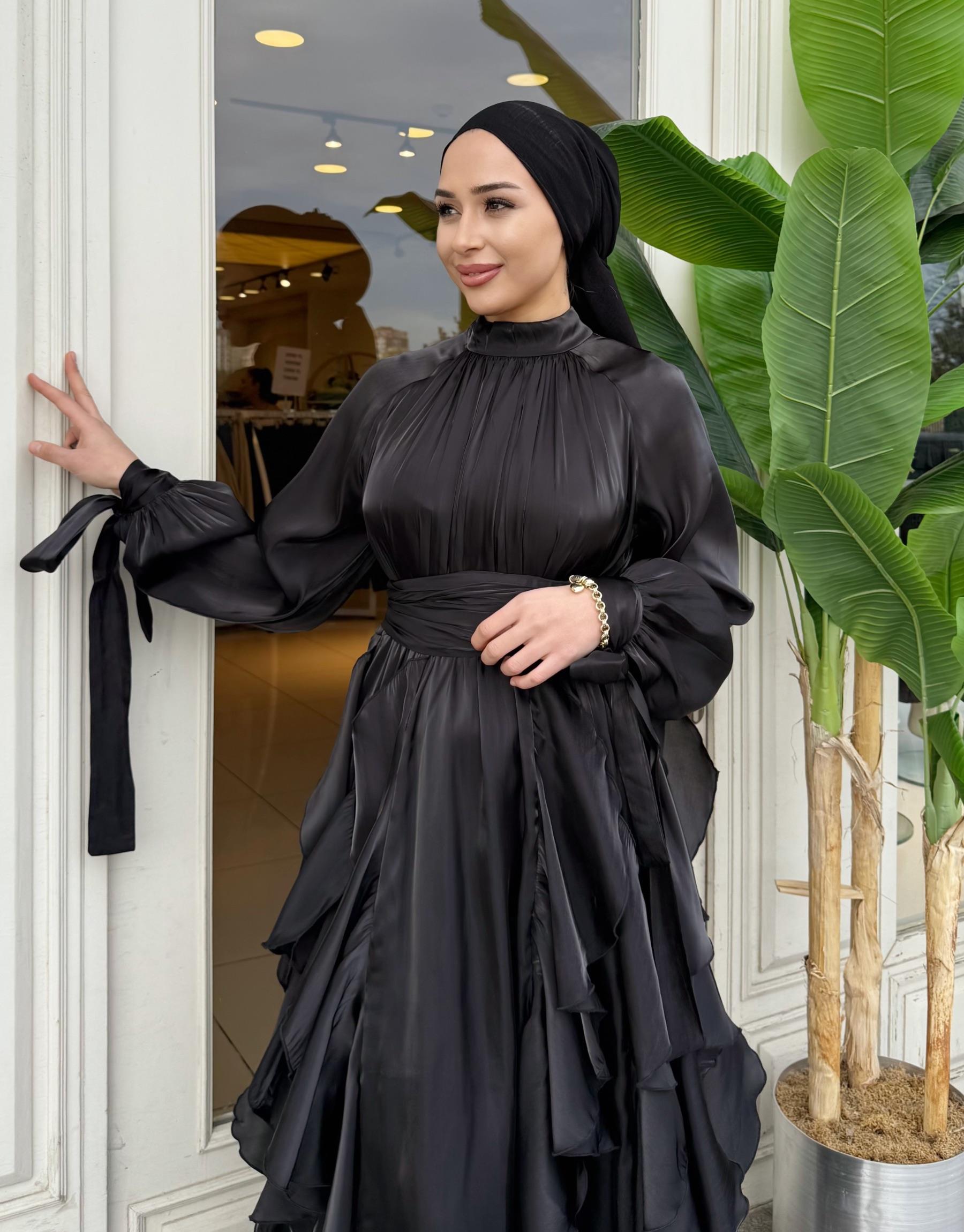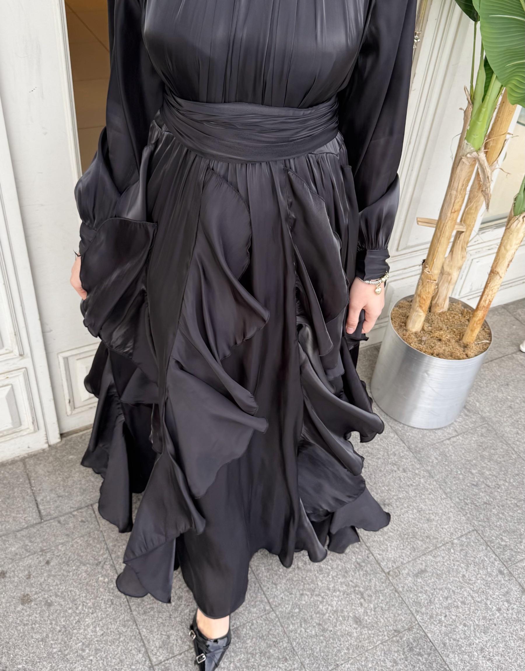FIRFIR DETAY KEMERLİ SATEN ELBİSE SİYAH