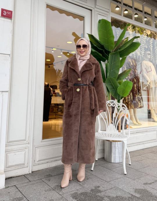 DERİ KEMER DETAY KÜRK KABAN KAHVE