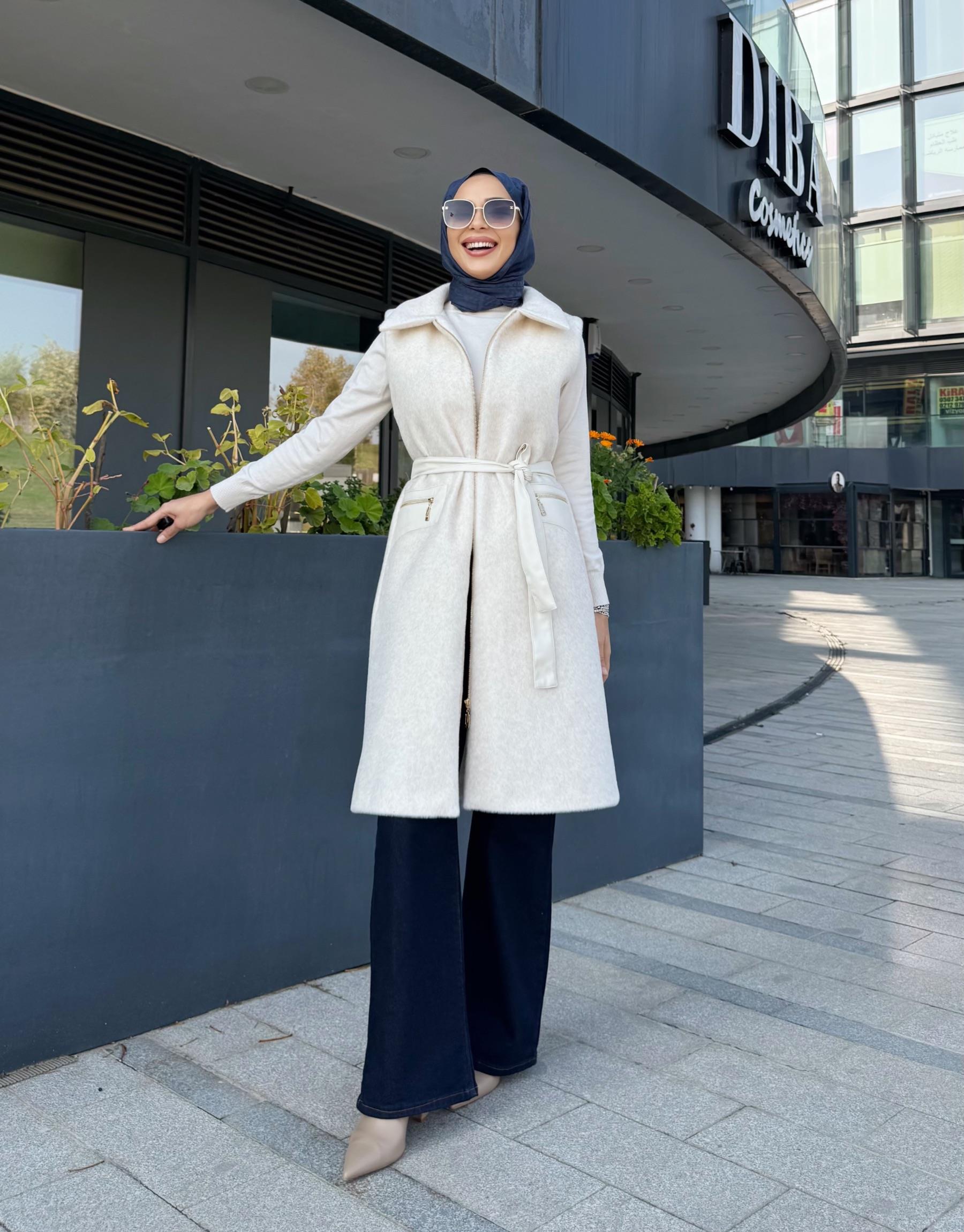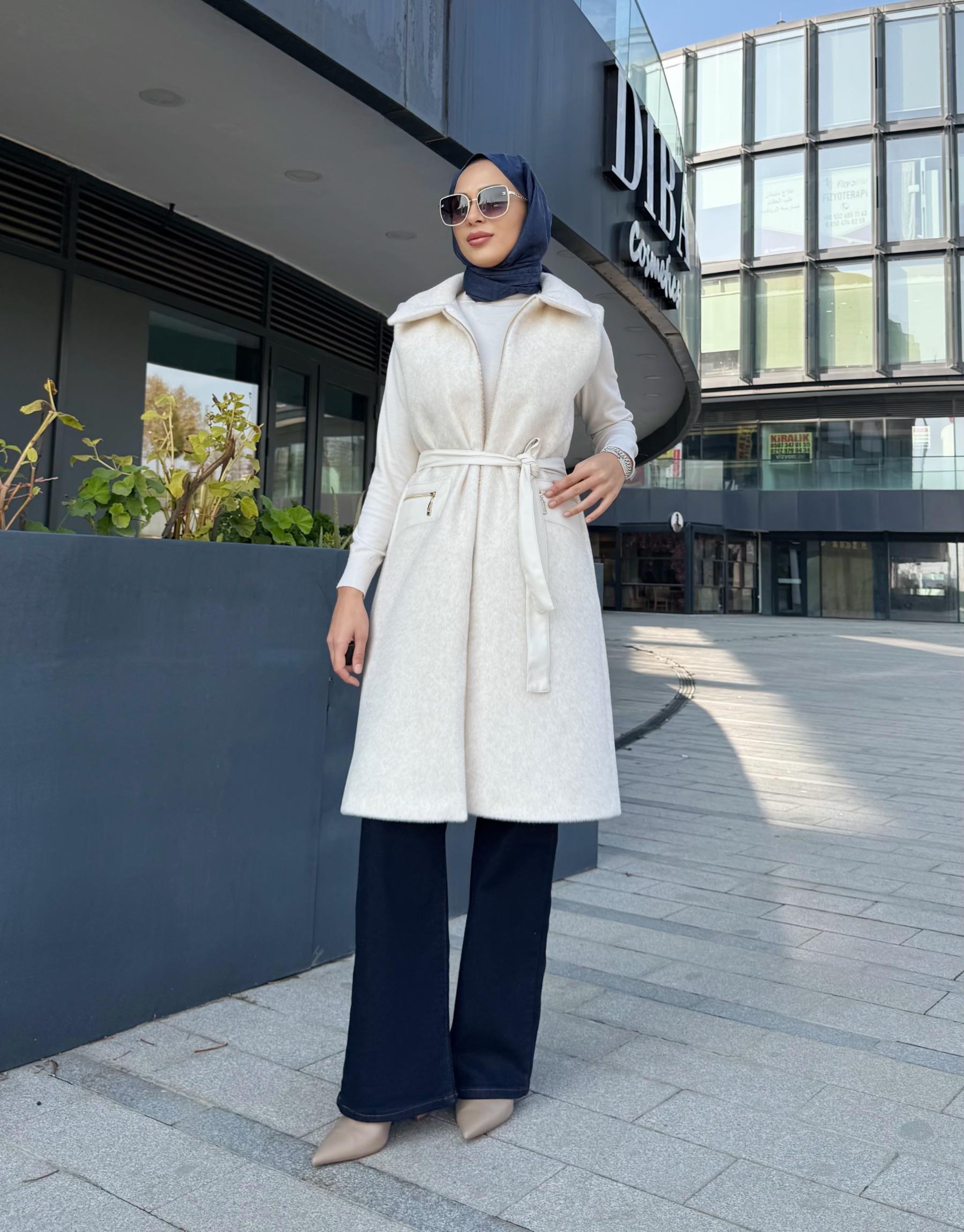DERİ CEP DETAY ANGORA YELEK EKRU