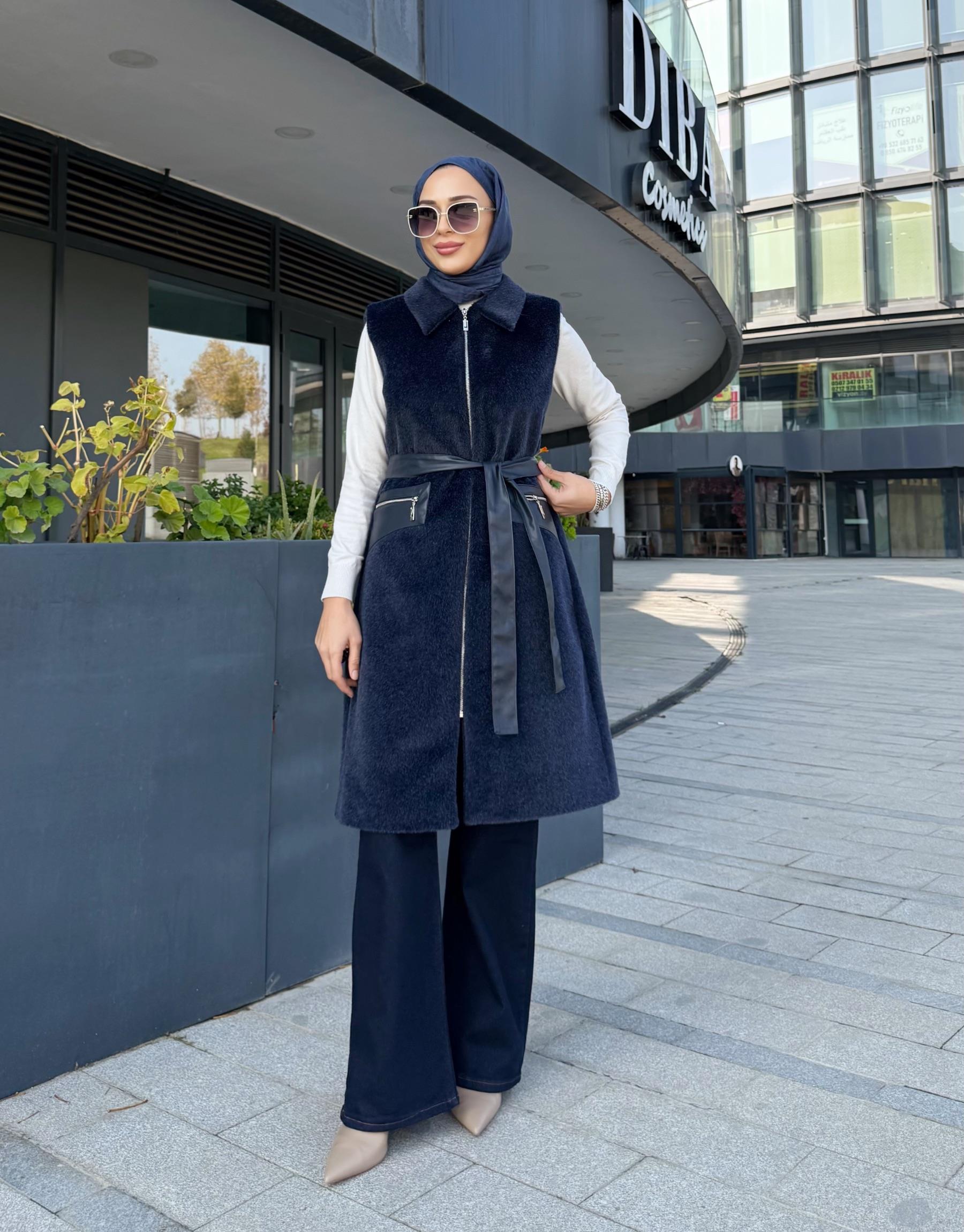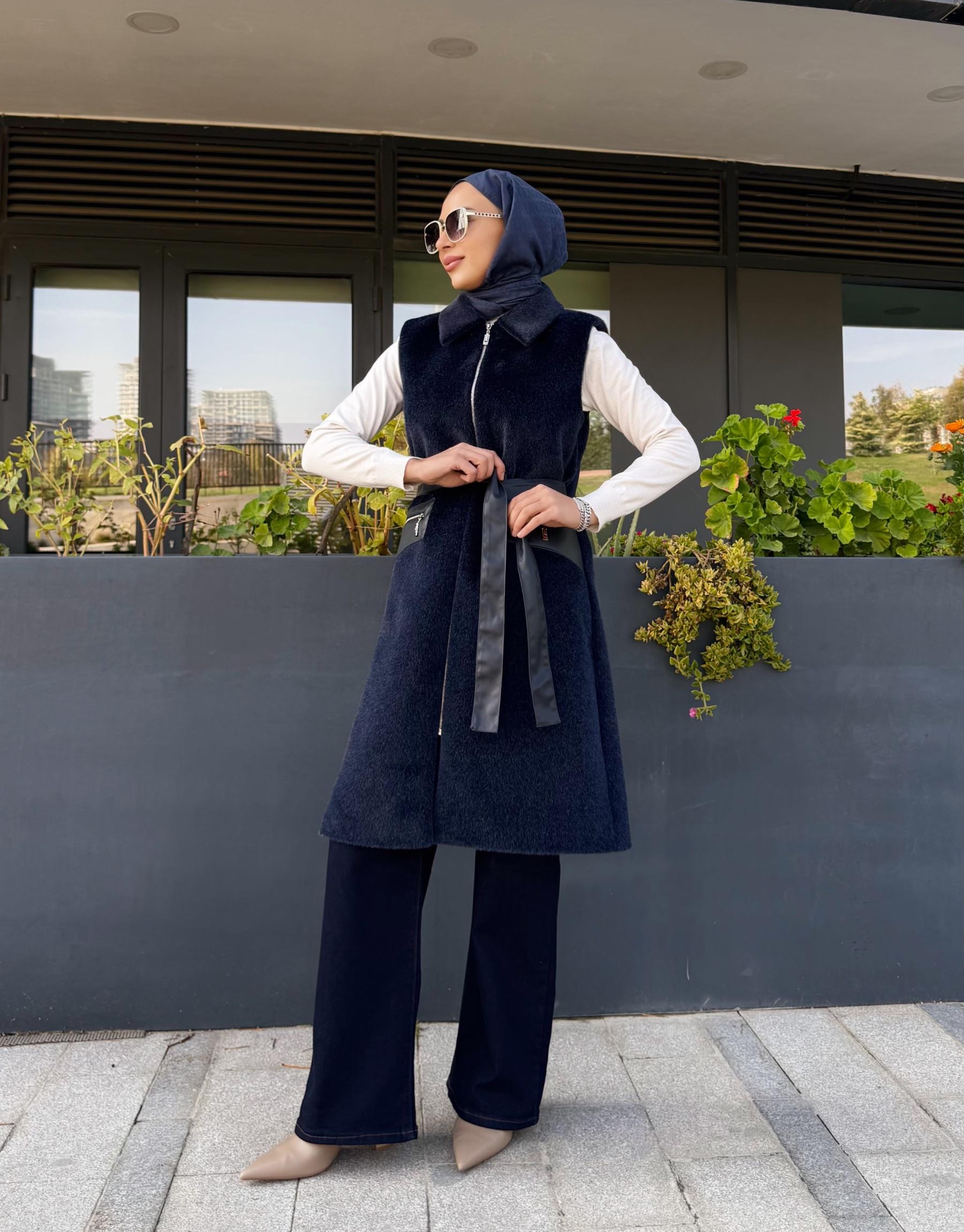 DERİ CEP DETAY ANGORA YELEK LACİVERT