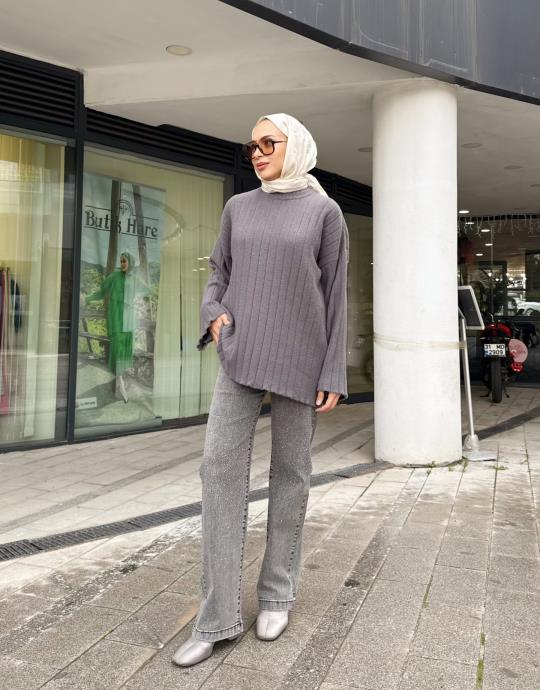 SİMLİ ÇİZGİLİ PELUŞ KAZAK FÜME