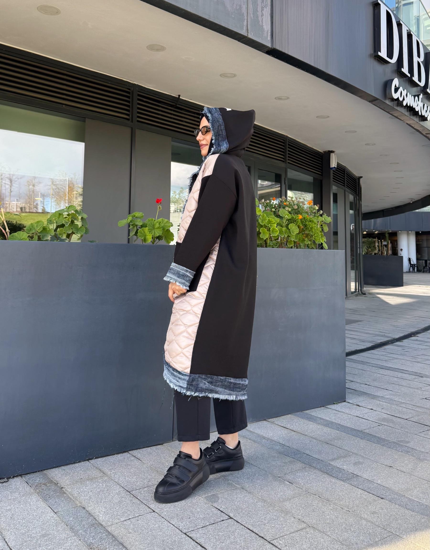 ÜÇ İPLİK BASKI DETAY KAPÜŞONLU KAP SİYAH