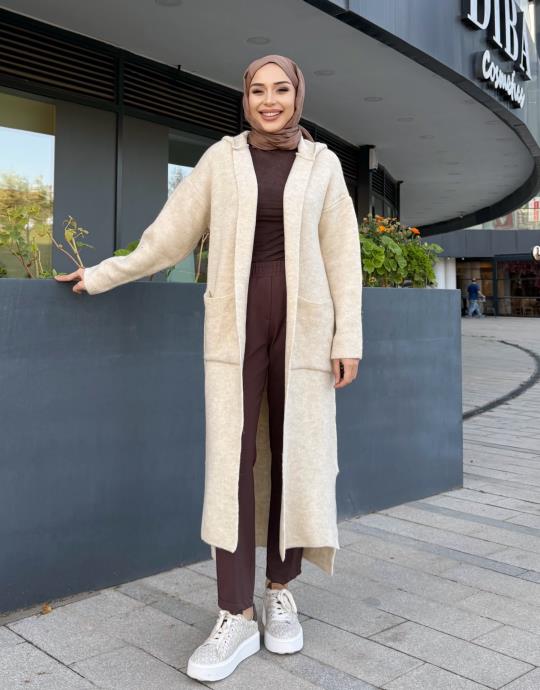 KAPÜŞONLU TRİKO HIRKA BEJ