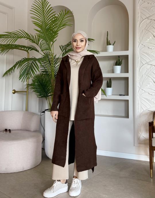 KAPÜŞONLU TRİKO HIRKA KAHVE
